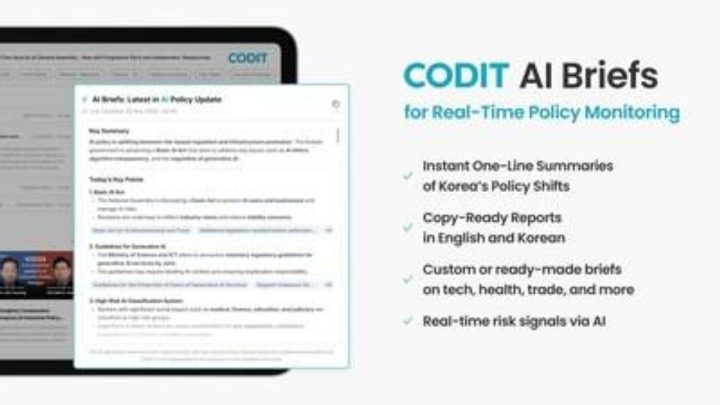 SEOUL, South Korea, June 16, 2025 /PRNewswire/ — CODIT, Korea’s leading policy intelligence platform, has announced the launch of AI Briefs, the first-ever AI-powered tool that delivers pre-selected, real-time policy briefings tailored to Korea’s rapidly evolving legislative and regulatory environment.